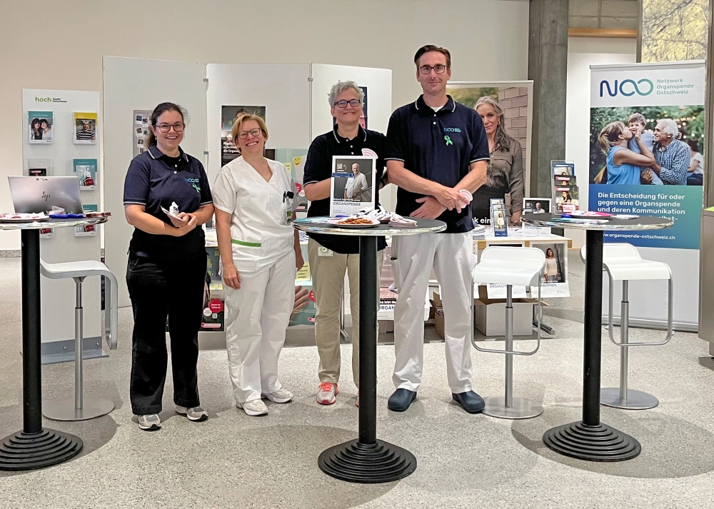 Das Netzwerk Organspende Ostschweiz (NOO) und SWISSTRANSPLANT (Nationale Dachorganisation) setzen sich gemeinsam dafür ein, Mitarbeitende sowie Besucherinnen und Besucher von HOCH Health Ostschweiz am Standort Kantonsspital St. Gallen für die Bedeutung der Organspende zu sensibilisieren. Anlässlich des Nationalen Tags der Organspende am 12. September 2025 veranstaltete das NOO-Team vor Ort eine Standaktion, um das Thema ins Zentrum zu rücken und allen Interessierten die Möglichkeit zu geben, Fragen zu stellen und Informationen aus erster Hand zu erhalten. Besonders erfreulich war, dass wir transplantierte Betroffene als Botschafterinnen und Botschafter für diese Aktion gewinnen konnten. So hatte das Publikum die Gelegenheit, sich direkt mit unseren Expertinnen und Experten auszutauschen.