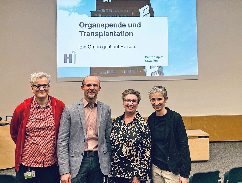 Über diese und viele weitere Themen referierten Yvonne Hilpertshauser, Oberärztin mbF der Medizinischen Intensivstation und Netzwerkleiterin NOO, Christine Sturm Oberärztin mbF an der Klinik für operative Intensivmedizin, Wolfgang Ender, Organspende- und Transplantationskoordinator sowie Isabelle Binet, Leiterin der Klinik für Nephrologie und Transplantationsmedizin. Sie vermittelten einen vertieften Einblick in die Thematik und hinter die Kulissen der Organspende und der Transplantationsmedizin.